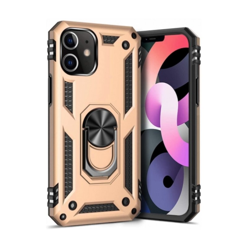Apple iPhone 12 (6.1) Kılıf Silikon Zırhlı Standlı Yüzüklü Mıknatıslı Tank Kapak - Gold