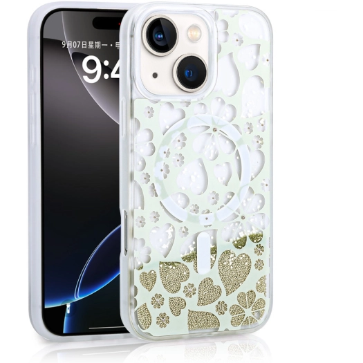Apple iPhone 13 (6.1) Kılıf Sıvılı Simli Baskılı Şeffaf Arka Yüzey Zore Mossa Silikon Kapak - Gold