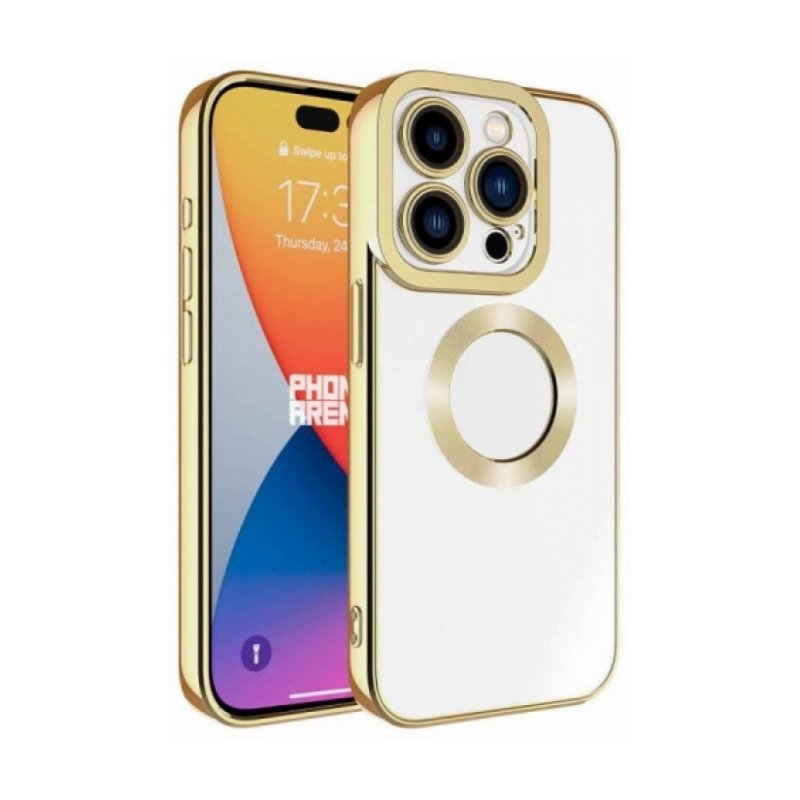 Apple iPhone 15 Pro Max (6.7) Kılıf Kamera Lens Korumalı Şeffaf Renkli Logo Gösteren Parlak Kapak - Gold