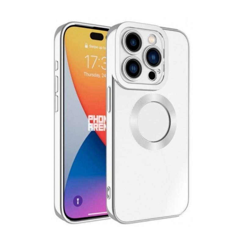 Apple iPhone 15 Pro Max (6.7) Kılıf Kamera Lens Korumalı Şeffaf Renkli Logo Gösteren Parlak Kapak - Gümüş