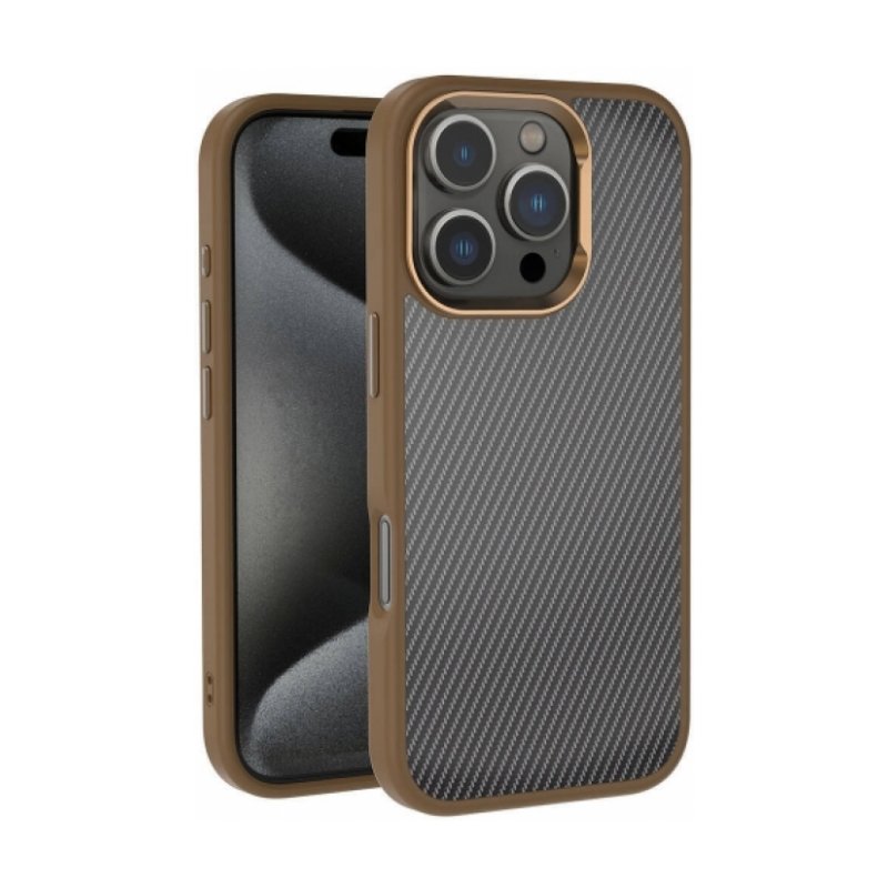 Apple iPhone 16 Pro (6.3) Kılıf Karbon Fiber Görünümlü Parlak Kamera Çerçeveli Venus Kapak - Rose Brown