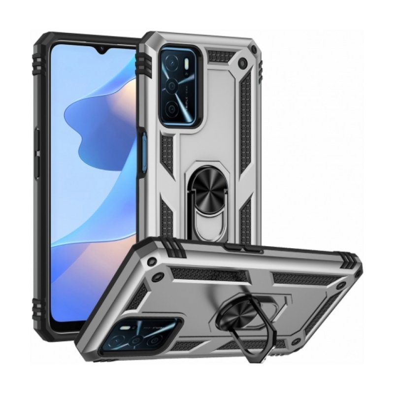 Oppo A16 Kılıf Silikon Zırhlı Standlı Yüzüklü Mıknatıslı Tank Kapak - Gümüş
