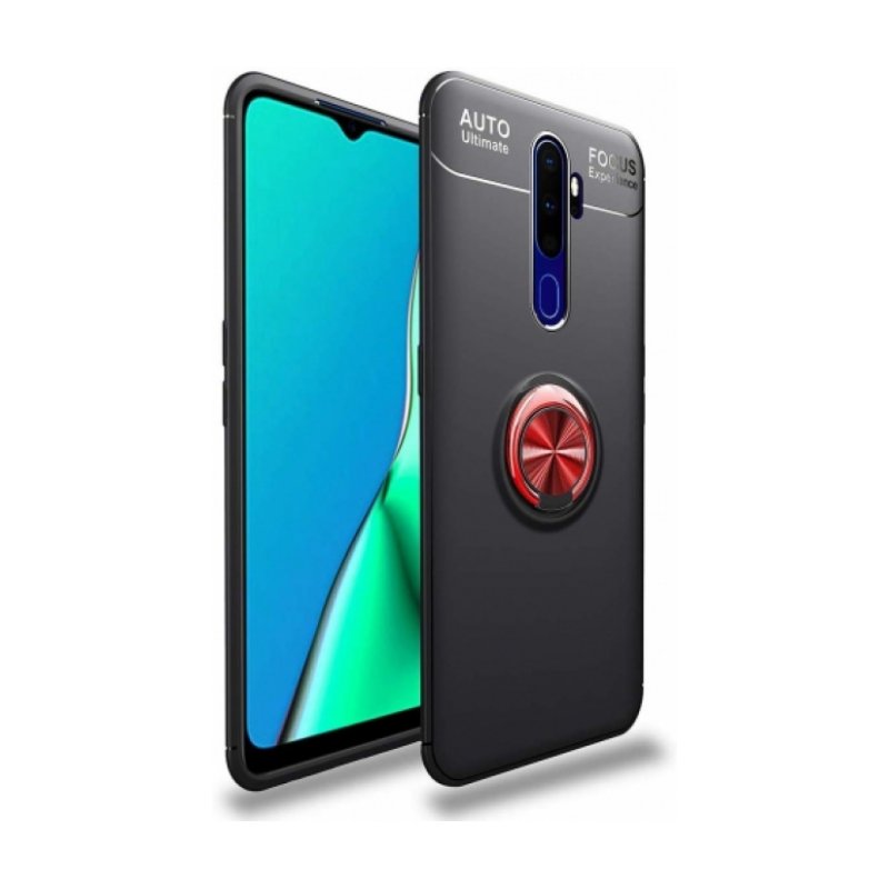 Oppo A5 2020 Kılıf Renkli Silikon Yüzüklü Standlı Auto Focus Ravel Kapak - Kırmızı - Siyah