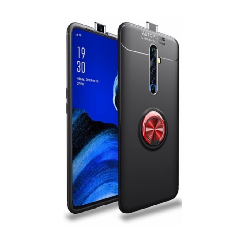 Oppo Reno 2z Kılıf Renkli Silikon Yüzüklü Standlı Auto Focus Ravel Kapak - Kırmızı - Siyah