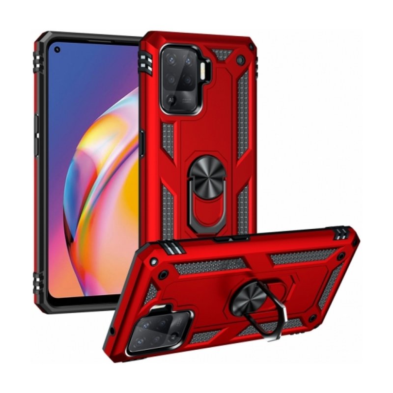 Oppo Reno 5 Lite Kılıf Silikon Zırhlı Standlı Yüzüklü Mıknatıslı Tank Kapak - Kırmızı