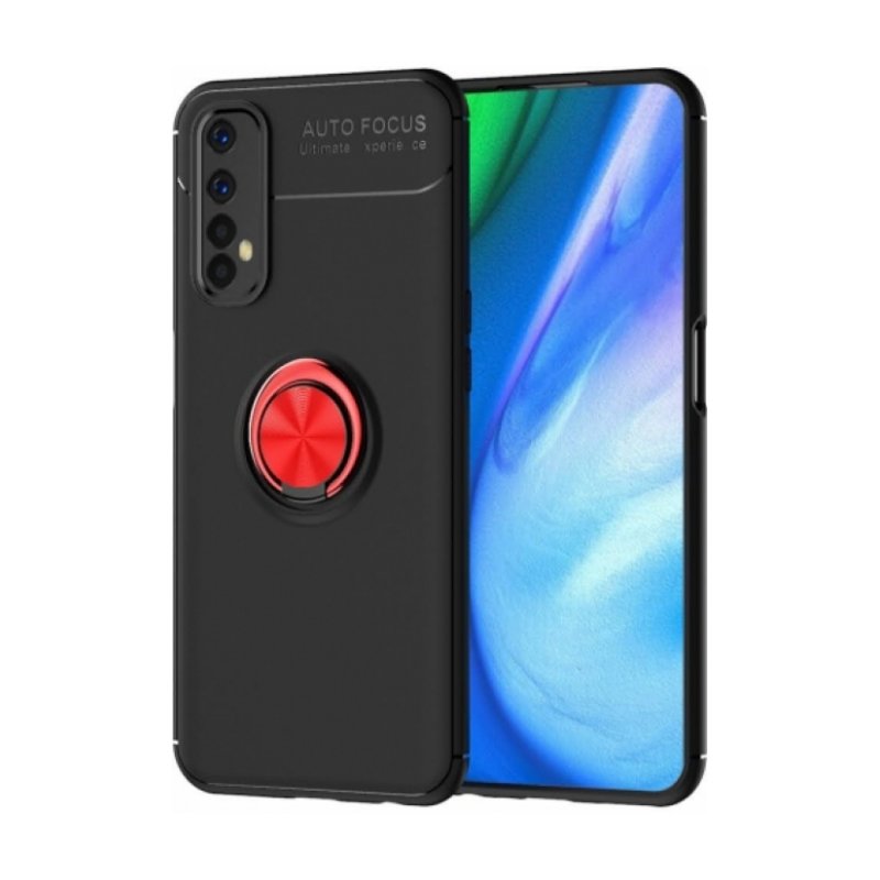 Realme 7 Kılıf Renkli Silikon Yüzüklü Standlı Auto Focus Ravel Kapak - Kırmızı - Siyah