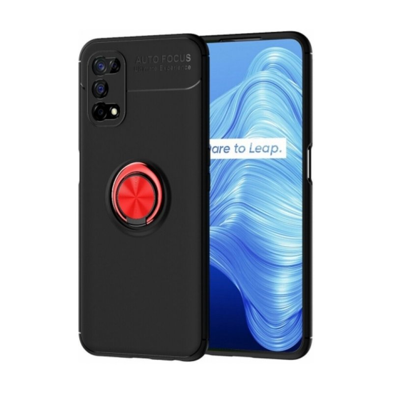 Realme 7 Pro Kılıf Renkli Silikon Yüzüklü Standlı Auto Focus Ravel Kapak - Kırmızı - Siyah