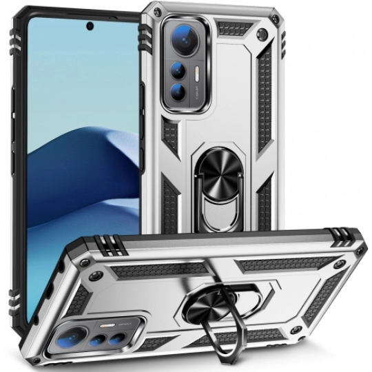 Xiaomi Mi 12T Pro Kılıf Silikon Zırhlı Standlı Yüzüklü Mıknatıslı Tank Kapak - Gümüş