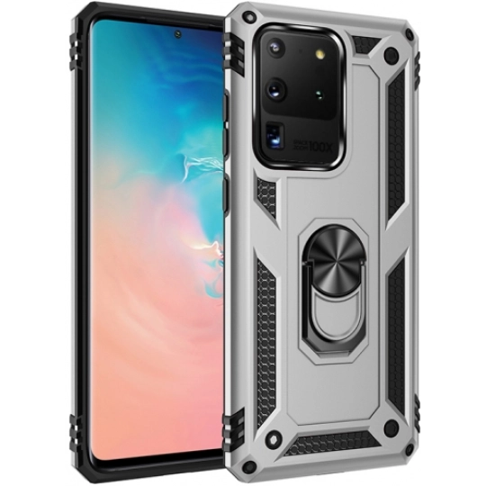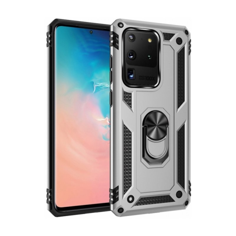 Samsung Galaxy S20 Ultra Kılıf Silikon Zırhlı Standlı Yüzüklü Mıknatıslı Tank Kapak - Gri