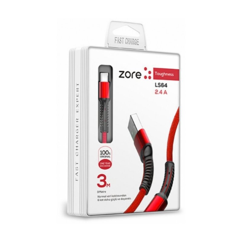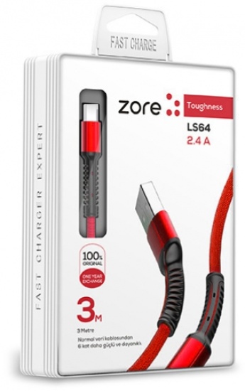 Zore LS65 Type-C USB Hızlı Şarj Data Kablosu 3m - Kırmızı